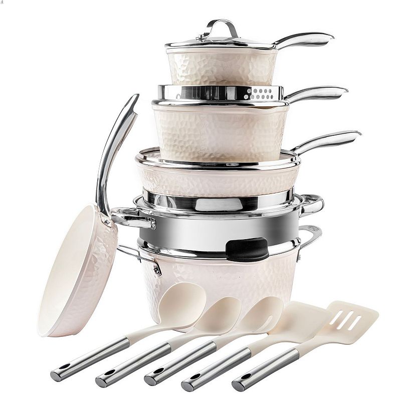 Gotham Steel Hammered 15 pc Cream Ultra-Ceramic Nonstick Cookware Set with Utensils, IvoryElegant yet practical - the Gotham Steel hammered collection is beautiful and makes a statement in every kitchen, yet nonstick, lightweight, scratch resistant and dishwasher safe. Elegant yet practical - the Gotham Steel hammered collection is beautiful and makes a statement in every kitchen, yet nonstick, lightweight,Gotham Steel