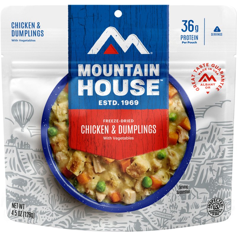 Mountain House Chicken and Dumplings - Camp Food And CookwareGear up for a big hike with the help of the Mountain House Chicken and Dumplings, which offers a satisfying, delicious taste. The recipe includes savory chicken, vegetables and fluffy dumplings in a white gravy. Just add water and get your fill. Take this pouch with you backpacking, or keep it for emergency use. ContaiMountain House