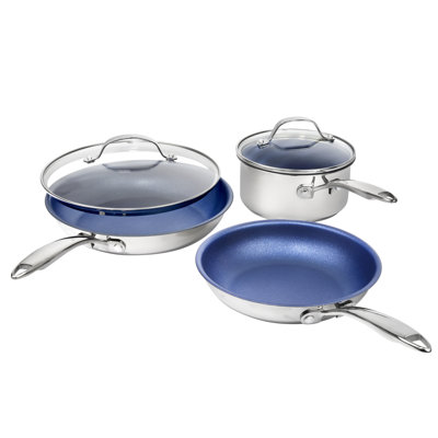 Granitestone Blue Stainless Steel 5 Piece Nonstick Cookware Set, Oven & Dishwasher SafeGRANITESTONE STAINLESS STEEL: Designed to deliver professional quality results day in and day out, we set out to create a high-quality, hard-working and affordable cookware collection for home chefs to use every single day. The result was a lightweight stainless-steel cookware set with a nonstick coating and achieves tGranitestone