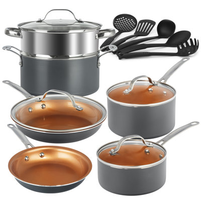 Gotham Steel 15 Piece Nonstick Cookware Set With UtensilsCook like a professional with this Gotham Steel 10-piece nonstick coating cookware set. Aluminum construction provides even heating and strength. The non-stick, dishwasher-safe ti-cerama coating delivers easy cleaning and lasting use. Gotham SteelGotham Steel