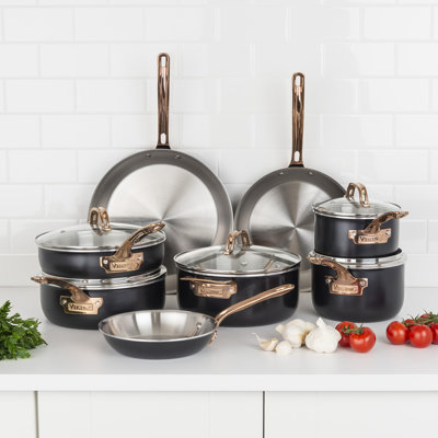 Viking Black & Copper Stainless Steel 13pc Cookware BundleThe Viking 3-Ply Stainless Steel Cookware Set pairs modern, elegant design with cutting-edge construction for a sophisticated 11-piece collection that can do it all in the kitchen. The matte black exterior and copper accents match our Limited Edition 7 Series Range and will complement any kitchen aesthetic. Our innovatViking