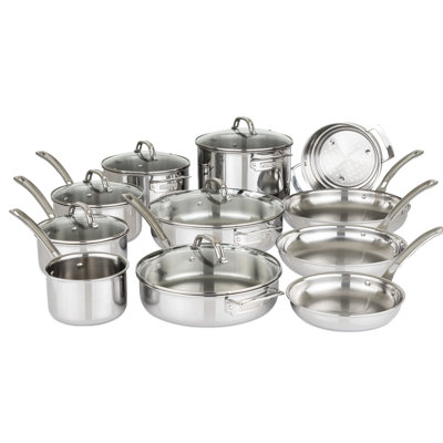 Viking 3-Ply 17 Piece Stainless Steel Cookware SetThe Viking 17-Piece 3-Ply Clad Stainless Steel Cookware Set features three layers of stainless steel and aluminum to distribute heat evenly throughout the pan, sides included. The set features vented glass lids that make it easy to see what is happening during the cooking process while also reducing the chance of boil-Viking