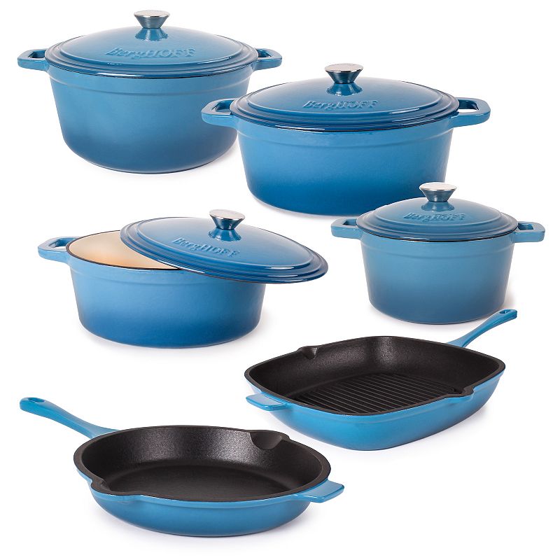 • BergHOFF Neo 10-pc. Cast-Iron Cookware Set, BlueOverhaul your cookware collection with this BergHOFF Neo 10-pc. Cast-Iron Cookware Set. Overhaul your cookware collection with this BergHOFF Neo 10-pc. Cast-Iron Cookware Set. The cast-iron cookware is designed for a lifetime of use Adds color to your kitchenWHAT'S INCLUDED 10-in. frypan, 11-in. grill pan, 3-qt. covere