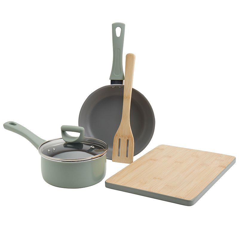 • Basic Essentials 5-pc. Nonstick Aluminum Cookware Set, GreenUpgrade your cooking experience with this 5-piece nonstick cookware set from Basic Essentials. Upgrade your cooking experience with this 5-piece nonstick cookware set from Basic Essentials. FEATURES Nonstick surface Tempered glass lids allow you to monito your food without disturbing the cooking process Safe for use on