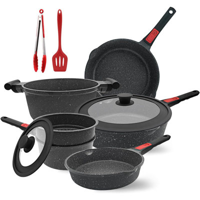 10 - Piece Non-Stick Aluminum Cookware SetHealthy Kitchen cookware set 10-Piece1 x 8-inch fry pan, 1 x 9.5-inch fry pan, 1 x 11-inch frying pan, 1 x 1.8 QT saucepan with lid+ 1 x steamer, 1 x 4.3 QT casserole Pot, 1x universal lid 28, 24 and 20 cm, 1x universal lid 20, 18 and 16 cm, 1x silicone spatula, 1x grill clip. Kazoo Color/Finish: BlackKazoo