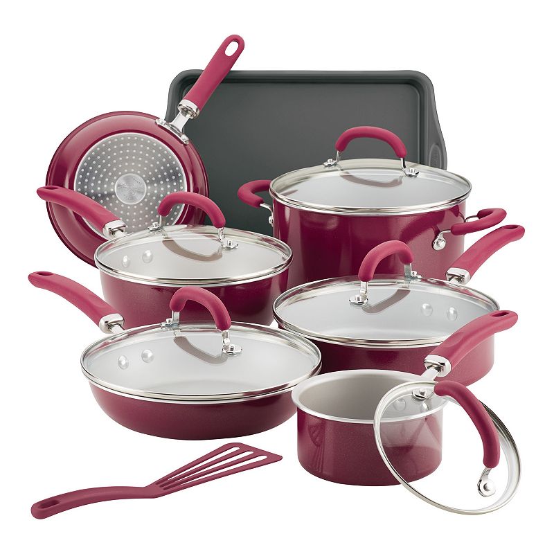 Rachael Ray Create Delicious 13-pc. Aluminum Nonstick Cookware Set, RedFor standout cooking style, this Rachael Ray Create Delicious cookware set is a must-have in every kitchen. Gift Givers: This item ships in its original packaging. If intended as a gift, the packaging may reveal the contents. PlatinumShield Technology enhanced silver nonstick reinforced to be nine times harder than titRachael Ray