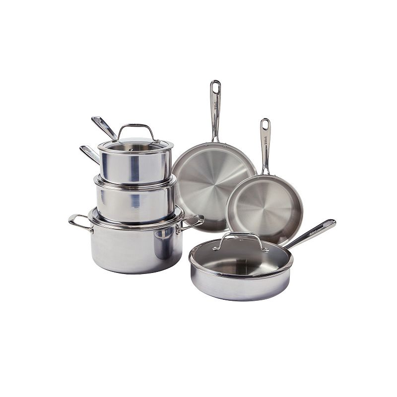 T-Fal Pro Tri-Ply Stainless Steel 10-Piece Cookware SetThis T-Fal Pro Tri-Ply Stainless Steel 10-Piece Cookware Set features a polished interior and a mirror-finish exterior bringing an air of sophistication to your kitchen, complemented by a cast riveted handle that seamlessly blends style with functionality to provide a secure grip.? The heavy-duty tri-ply stainless steeT-Fal