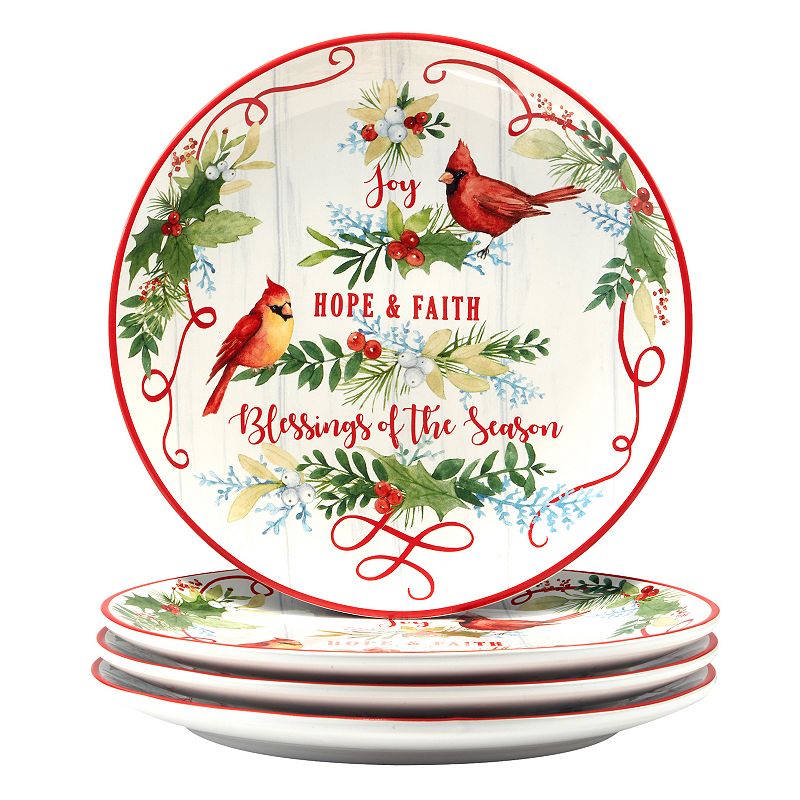 Certified International Winter Greens 4 Dinner Plates Set, MultiThe Winter Greens Dinner Plate, with an 11-inch diameter, is a beautifully crafted dish that captures the heartwarming essence of the holiday season. FEATURES Symbolic Imagery: The cardinals are not only a touch of natural beauty but also represent hope and joy, making every meal served on this plate a more heartfelt eCertified International
