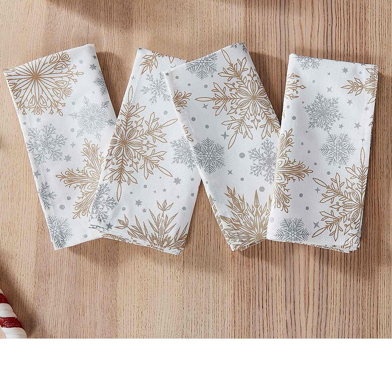 Avanti Snowflakes 4-pc. Dinner Napkin Set, WhiteThe Avanti Snowflakes Holiday Table linens features an allover design with large metallic gold snowflakes and smaller silver ones, along with stars and dots on a white ground. The Avanti Snowflakes Holiday Table linens features an allover design with large metallic gold snowflakes and smaller silver ones, along with stAvanti