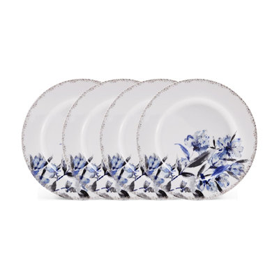 Tiodora 9'' Earthenware Dinner Plate , Set of 4Vibrant blue flowers gracefully climb the sides of crisp white dinnerware, complemented by a striking platinum dotted band that adorns the rim of each piece, creating a sophisticated contrast. Wildon HomeWildon Home