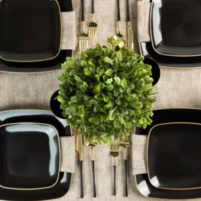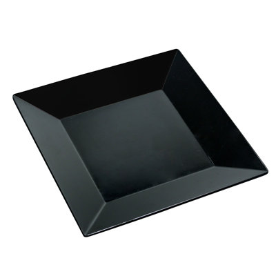 Ecoquality 14" inch Disposable Square Black with Gold Rim Plastic Serving Dinner PlateMESS FREE CLEAN UP: These black plastic plates with gold rim design will make any catering event or dinner fabulous. Save yourself the time dishwashing and cleaning up with our easily reusable and disposable plates. Sturdy enough to serve your favorite treats. Just toss your plates when you're done with no clean up necEcoQuality
