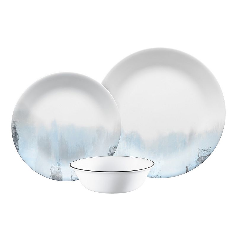 Corelle Tranquil Reflection 12-pc. Dinnerware Set, White/BlueAdd subtle, artistic character to your table setting with the Tranquil Reflection dinnerware set by Corelle.Watch the product video here.PRODUCT FEATURES Painterly brushstrokes and hushed tones on a mineral gray background Sturdy vitrelle glass construction WHAT'S INCLUDED Four 10.25-in. dinner plates Four 8.5-in. luncCorelle