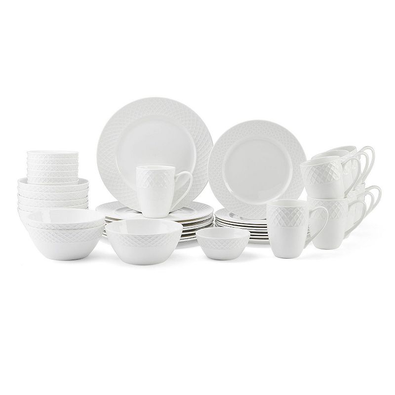 Mikasa Trellis 40-Piece Dinnerware Set, WhiteBring a touch of sophistication to any table setting with the modern simplicity of this Mikasa Trellis Dinnerware Set. FEATURES Brings sophistication to any table using minimalist style, clean lines, and smooth, pure white surfaces 40-piece dinnerware set includes 8 each of: 11-inch dinner plate, 9-inch salad plate, 6.Mikasa