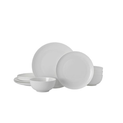 Kyler 12-Piece Lightweight Chip-Resistant Bone China Dinnerware Set, Service for 4The Mikasa Kyler 12-Piece Set includes: 4- 11 inch dinner plates, 9 inch salad plates, and 6 inch all purpose bowl (23 fluid ounce capacity) made from chip-resistant, microwave and dishwasher safe bone china. The simple white design features an embossed line detail around the rim that adds a touch of elegance to your tMikasa