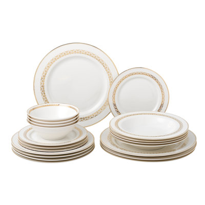 Lorren Home Trends 20 Piece Bone China Dinnerware Set, Service For 4This elegant bone china set has a durable quality with a delicate and exquisute look. This pattern by Lorren Home Trends is a bold but elegant design featuring a thick gold designed band on light weight translucent bone china. Elegant for a fancy dinner party, but sturdy for everyday use. Service for 4 people. Set InclLorren Home Trends