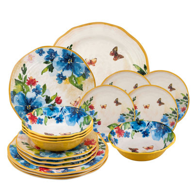 Butterfly 16 Piece Melamine Dinnerware Set, Service for 4Set a gorgeous dining table with blue floral and butterfly print pieces that coordinate perfectly. It's shatterproof and food safe properties make it the perfect entertaining piece. Easy to clean and top-rack dishwasher safe. Red Barrel StudioRed Barrel Studio