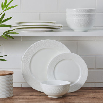 Haven 12-Piece Lightweight Chip-Resistant Bone China Dinnerware Set, Service for 4Basic white breaks from tradition with this Haven 12-Piece Dinnerware Set by Mikasa. Beautifully crafted of chip-resistant, high-quality bone china, each piece in this stylish collection features embossed detail with a distinct raised edge. The simple white bodies make this pattern perfect for casual or formal dining aMikasa