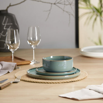 Kook Larmont Dinnerware set, Serves 4, 12 pieceLess is more. Blending minimalist with a hint of rustic, this dinnerware set brings a warm air to the modern table. Its crafted from earthy and sturdy stoneware and is finished with a raised burnt-copper rim. Perfect for serving salads, mains, and soups! Hokku Designs Color: Sage GreenHokku Designs