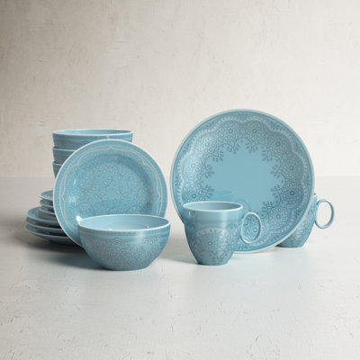 Kure 16 Piece Dinnerware Set, Service for 4This 16-piece dinner set features a sculpted floral pattern that's sure to fit right in with farmhouse kitchens and traditional dining rooms alike. It's crafted from durable, scratch-resistant stoneware in a charming, aqua blue color with a glossy, glazed finish. This set includes dinner plates, dessert plates, cerealBirch Lane