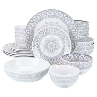 12 Piece Dinnerware Set, Service For 4Gray antiqued pieces with a striking swirl design are adorned with a blue floral pad print pattern and framed with metallic rims.12-piece set, service for 4, includes 4 each of: 10-1/2 inch dinner plate; 2-1/2 inch tall 32-ounce pasta bowl with an 8-inch diameter; and 3-inch tall 25-ounce all-purpose bowl with a 6-inchRosalind Wheeler
