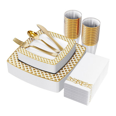 175 Piece Dinnerware Set for 25 Guests - Square Plastic Plates with DiamondDinnerware Set is safe for you and your guests! The disposable dinnerware set is made of 100% food-grade plastic and is BPA-free. The heavy-duty dinner plates and salad plates offer reliable strength and durability, ensuring they won't scratch or break easily. SAPESHA Color: GoldSAPESHA