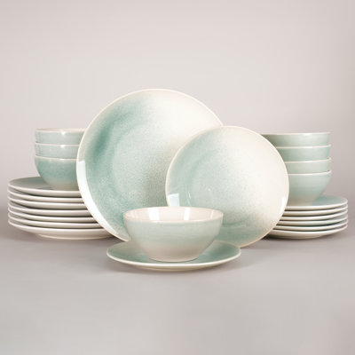 Latitude Run Tempus Plates And Bowls Sets, 24 Piece Dinnerware SetsThis dinnerware set with nature-themed is both romantic and fresh, and it looks like an exquisite piece of art when placed on the table.These dishes include 8 dinner plates,8 salad plates,and 8 cereal bowls, meeting the needs of 8 people. It features a handcrafted gradient color design, using reactive glaze made from nLatitude Run