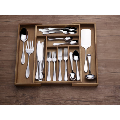 Bravo 52-Pc Flatware Set W/Expanding Caddy, Stainless Steel, Service For 8This Mikasa Bravo 52-Piece Flatware Set with Expanding Caddy elevates both casual and formal place settings with a simple teardrop shape and shiny finish with a gently ridged edge for added definition and style. The 6-compartment caddy keeps flatware neat and organized and can be carried easily from drawer to table. ThMikasa