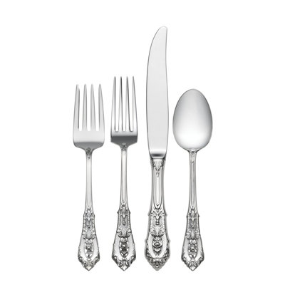 Rose Point 4 Piece Sterling Silver Flatware Set, Service for 1Suspended in a web of silver lace, a rose in bloom floats within a frame of deep scrolls and shimmering dewdrops. The intricate piercings provide a lovely counterpoint to the surrounding motifs. WallaceWallace