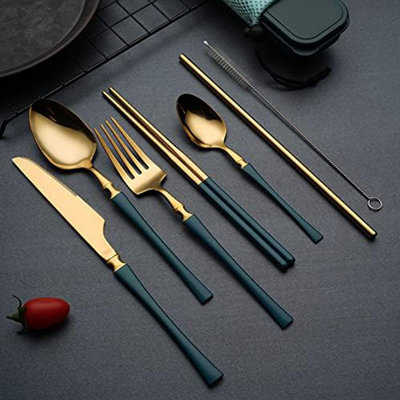 Wrought Studio Kardo Stainless Steel Flatware Set7-Piece Reusable Utensils with caseincludes 1 x dinner knife, 1 x dinner fork, 1 x dinner spoon, 1 x Teas/ soup spoon,1 pair of chopsticks, 1 x straight straw, 1 x straw brush, packing in a gift box. Winston Porter Color: B-GreenWinston Porter