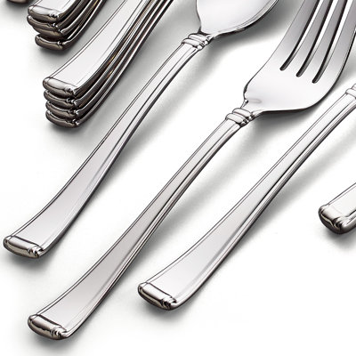 45 Piece 18/10 Stainless Steel Flatware Set, Service for 8Crafted of durable 18/10 stainless steel, the Column 45-piece Flatware Set coordinates well with formal and casual dinnerware. This elaborate set is dishwasher-safe and includes eight dinner forks, salad forks, dinner knives, tablespoons, and teaspoons, as well as a serving spoon, pierced serving spoon, butter knife, sHampton Forge