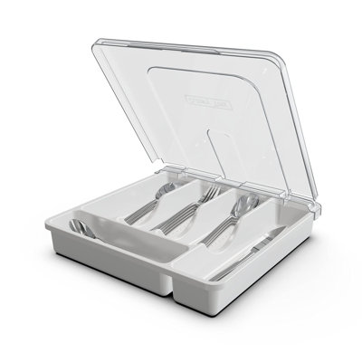 Casella 2.7" H x 12" W x 11.8" D Flatware & Kitchen Utensils Drawer OrganizerTableware organizer with lid is dust-proof to keep your Utensil clean while put them in the countertop and drawer. No need to clean again when you use Silverware. Cutlery Organizer with 5 rectangular compartments allow you to safely store and organize forks, knives, spoons, chopsticks, wine openers, spatulas, tongs andRebrilliant