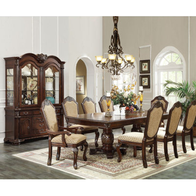 9-ps Formal Dining Table Set Kitchen Furniture Set Include 1 Extendable Dining Table, 6 Side Chairs And 2 Arm Chairs, Set For 8 PersonsThe Traditional Dining Collection features elegant styling decorative carvings and a combination of hardwood and veneers. The double pedestal dining table, upholstered chairs are all accented by decorative base and shell motifs. DAE Table Top Color: TanDAE