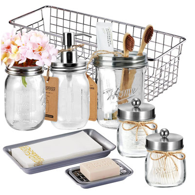 Bathroom Accessories Set 8 PCS-Glass Gift Set Bathroom SetPackage includes lotion dispenser bottle, toothbrush holder, soap dish, toothbrush holder, 2 cotton swab bottles, vase, toilet paper basket. Makes a great DISPLAY PIECE with this mason jar flower vase on the bathroom vanity,countertop or any living room, bedroom, kitchen, bar, or table top. Create your own natural andOne Allium Way