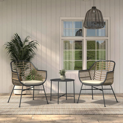 Olilawn 3 Piece Patio Set Outdoor Patio Conversation Set, Two Wicker Seating Chairs with Cushions and Coffee Table, Boho Seating Chat Set for Indoor OBOHO STYLE: Clean lines and distinct Bohemian open-weave style add a touch of inviting minimalism to your patio, porch, or balcony. Our outdoor bistro set includes 2 comfortable wicker chairs and a round accent table, ideal modern decoration for your outdoor space. olilawnolilawn