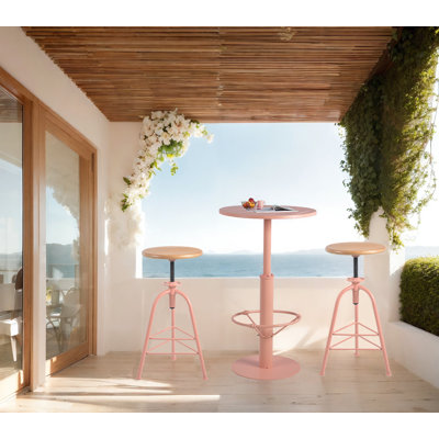 SET OF 3, Patio Balcony Front Porch Bar Set, Cocktail Bistro Bar Height Pub Table & Stools Set, 41" Tall Rustic Industrial Bar Table And 2 Solid WoodPRODUCT INFORMATION - TABLE:Color:Pink;Overall height: 41",Desktop diameter: 23.6" ,Base diameter: 17.7";CHAIR:Color:Pink+Oak Color;Size: 16.54"(L) x 16.54"(W) x24.4"-28.35"(H),Adjustable seat height: 24.4"-28.35".Material: Metal+Wood House of HamptonHouse of Hampton