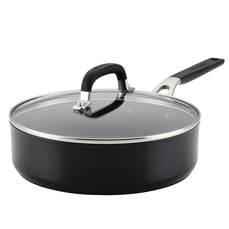 KitchenAid Hard-Anodized Nonstick Deep Frying Saute Pan with Lid, 3-Quart, Onyx BlackPrepare time-honored family recipes and new favorites for years to come with the KitchenAid hard-anodized nonstick saute pan with lid. Crafted from durable hard anodized aluminum that is 6x harder than traditional aluminum for quick heat distribution and everyday use Deep skillet handle rivets have been finished with tKitchenAid