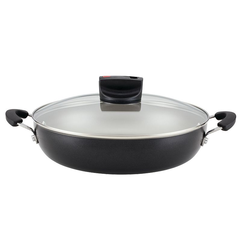 Farberware Smart Control Aluminum Nonstick Everything Pan with Lid, BlackThis Farberware Smart Control everything pan features a tempered glass lid with an innovative vent in the knob for easy steam release and fewer boil-overs. Durable aluminum pan construction features a trimmed base for quicker, even heat conduction and years of cooking enjoyment Family pan boasts DiamondMax nonstick tecFarberware