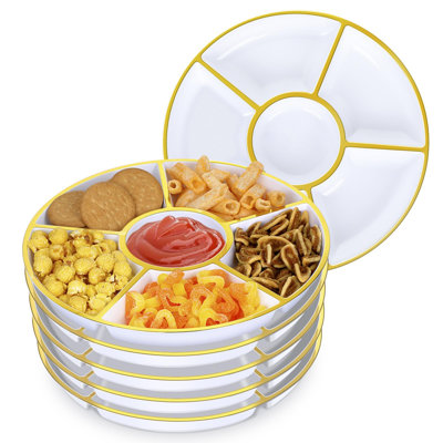5 Pcs Serving Trays For Party Fruit Platters And Trays Clear 6 Sectional Round Veggie Tray With Gold Rim Reusable Plastic Divided Appetizer Tray FoodThis product are differt from other plastic serving trays, it have five compartment and a middle compartment. The veggie tray can provide a variety of options. The 5 compartments on the side can be used to place your favorite snacks, fruits, vegetables, cheese, nuts, crafts and etc; The round compartment in the middleEverly Quinn