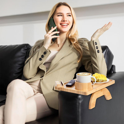 Couch Cup Holder, Sofa Arm Tray With 360 Rotating Phone Holder & Cup Holder, Folding Anti-Slip Couch Arm Table, Wood Couch Tray Clip On Side Table FoOur sofa armrest tray comes with a 360 rotating phone stand that allows you to line up your screen with your line of sight for easy video viewing. The grooves are fitted with non-slip silicone pads to prevent the phone from slipping off. It has detachable and rotatable cup holders for easy access to drinks from eitherMillwood Pines