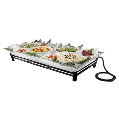 Original Large Ice Housing System With Ice Pan, Drainage Hose, And Led LightingOriginal style large rectangle metal ice carving pedestal - perfect for double-wide horizontal ice sculptures or for any iced food or beverage presentation Cal-Mil Color: PlatinumCal-Mil