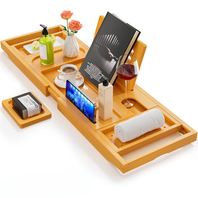Premium Bathtub Tray Caddy - Expandable Bath Tray - Unique House Warming Gifts, New Home, Anniversary & Wedding Gifts For CoupleBamboo bath tray for bathtub is equipped with a phone, wine, candle hole, 2 removable spa trays, and tablet/book holder, also includes a free soap holder. Treat yourself to the most relaxing bath experience ever and enjoy a home spa treatment in luxury. This bamboo bathtub tray is designed to expand from 28.5" to 41" (Rebrilliant