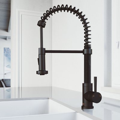 VIGO Edison Pull-Down Spray Kitchen Faucet In Matte BlackThe Vigo Edison Pull-Down Spray Kitchen Faucet is a highly functional and beautiful statement piece. Spiral details and solid brass construction of this faucet gives your kitchen a restaurant-quality look.Reach EverywhereThe pull-down, dual-action spray head on the Vigo Edison Pull-Down Spray Kitchen Faucet allows forVIGO