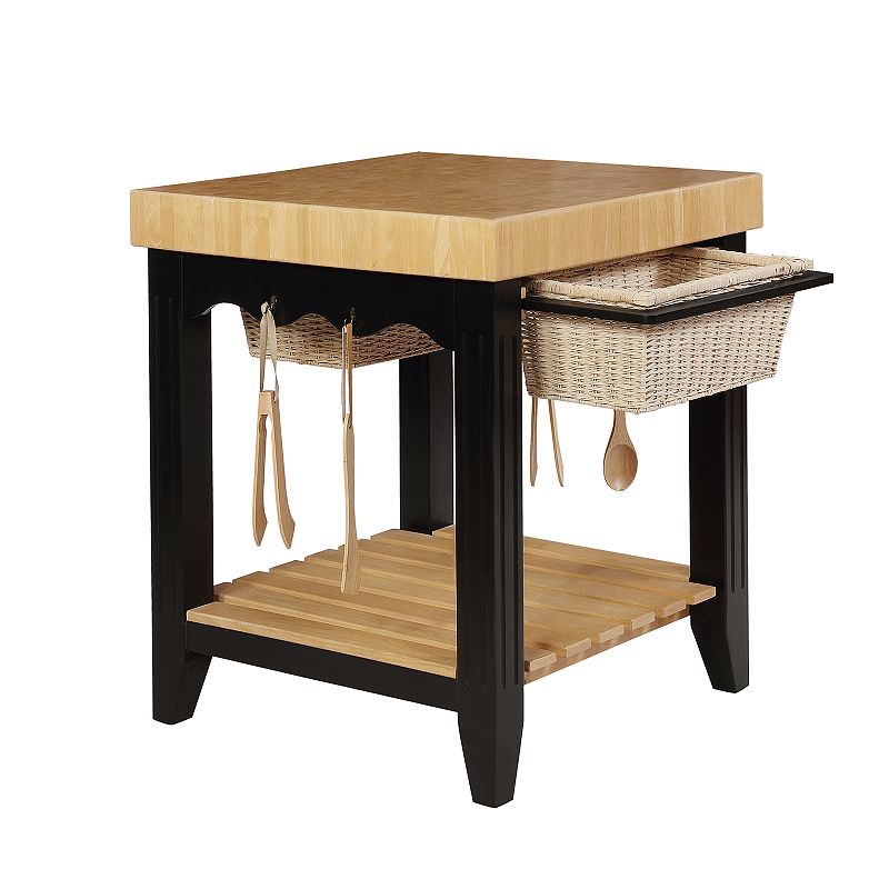 Linon Color Story Butcher Block Kitchen Island, BlackAdd extra storage and counter space to your kitchen with this Linon Color Story Butcher Block Kitchen Island.Two basket drawersButcher block topOne shelfIncluded tongs, spatula and spoon36.38"H x 29.92"W x 29.92"DWeight: 99 lbs.MDF, rubberwood, rattanAssembly requiredManufacturer's 180-day limited warrantyFor warrantyLinon