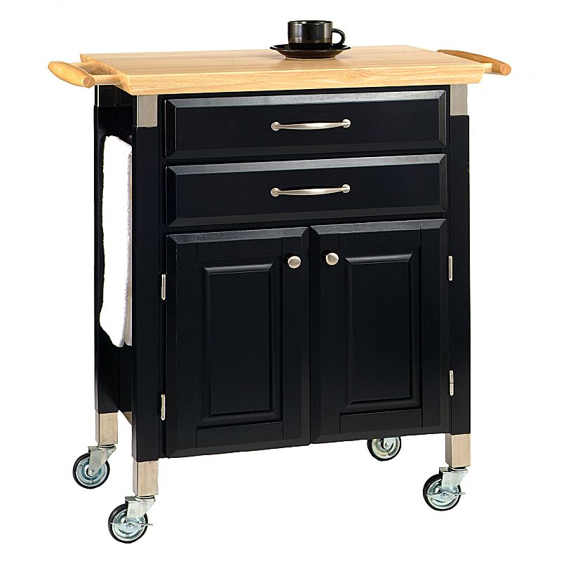 Dolly Madison Prep & Serve Kitchen Cart - Natural Wood Top, BlackPrepare anywhere with this kitchen cart. Its versatile design makes it the perfect addition to your kitchen. Brushed steel hardware enhances the elegant style. Drawers and towel bar offer convenient organization. Doors conceal an adjustable shelf for more storage. Industrial-grade casters allow for easy movement. 36"Hhomestyles