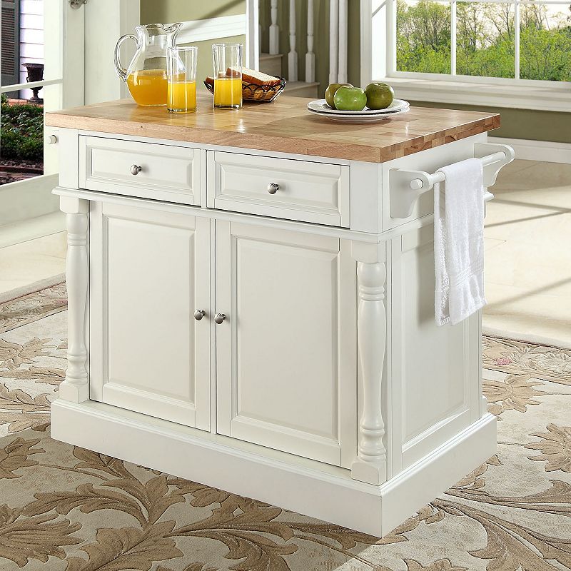 Crosley Butcher Block Top Kitchen Island, WhiteBring charm & style into your kitchen with this practical island from Crosley.PRODUCT FEATURES Butcher block top creates a stable, versatile workspace. Push-through drawers add convenience. Cabinet provides concealed storage. 36''H x 48.25''W x 23''D Weight: 132 lbs Wood Assembly required Wipe clean Manufacturer's 90-dCrosley