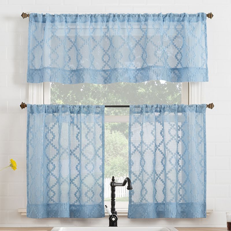 No. 918 Tina Geometric Clipped Jacquard Semi-Sheer Rod Pocket 3-piece Kitchen Curtain Valance & Tiers Set, Tranquil BlueAdd a touch of elegance to any window with this three-piece curtain valance and tiers set from No. 918.Click this HOME DECOR & FURNITURE GUIDE to find the perfect fit and more! Add a touch of elegance to any window with this three-piece curtain valance and tiers set from No. 918. Click this HOME DECOR & FURNITURE GUIDENo. 918