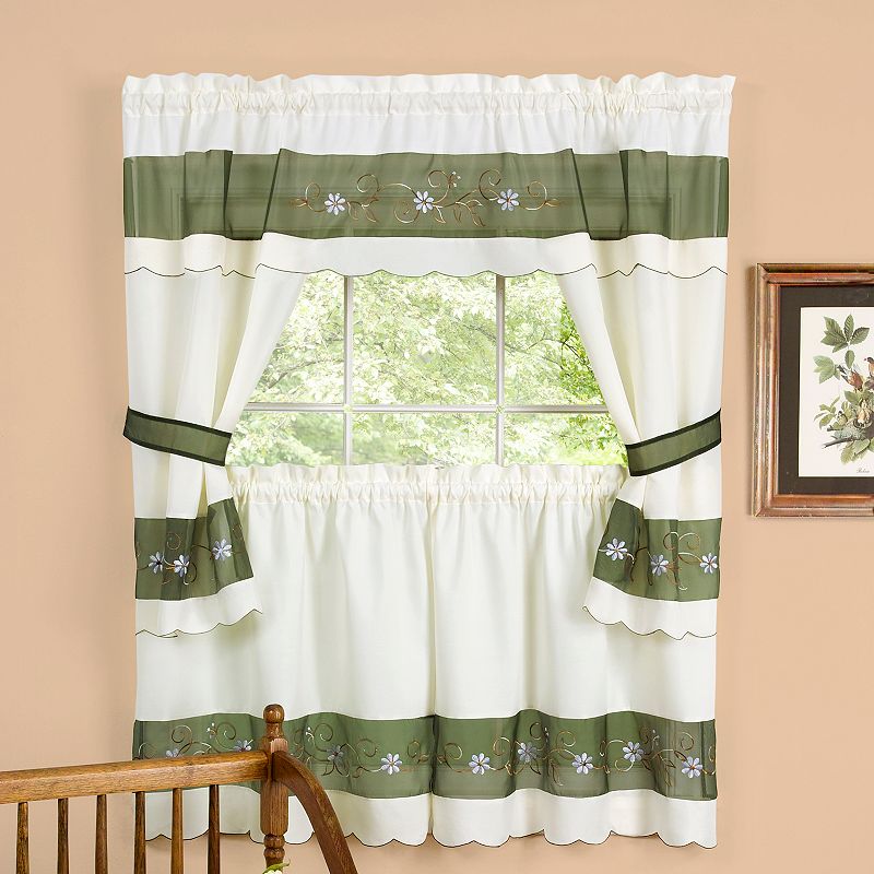 Berkshire 5-pc. Swagger Tier Cottage Kitchen Curtain Set, GreenFeatures 5-piece set Rod pockets Split top swagger panel Attached tailoredvalance Flower details Easy care What's Included 2 tier curtains Valance/panel: 58 x 36 2 tiebacks Construction & Care Polyester Machine wash Imported Size: 29X24. Color: Green. Gender: unisex. Age Group: adult. Pattern: Pattern.Achim