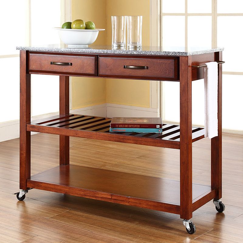 Crosley Granite Top Kitchen Cart, RedThis Crosley kitchen cart goes where you need it.PRODUCT FEATURESSolid granite tabletop creates a stable, versatile workspace.Locking caster wheels provide durability and movement.Drawers provide concealed storage.Removable shelf allows you to nest the stools or store large items.Towel bar offers convenience.UpholstereCrosley