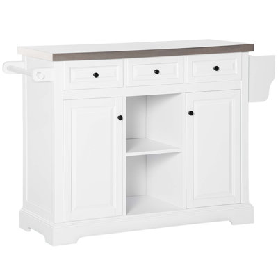 Rolling Kitchen Island, Kitchen Cart with Stainless Steel Top, Spice Rack & Drawers, WhiteFood Prep Ready: The stainless steel top of this kitchen island on wheels offers a quality and easy-to-clean surface for food preparation. Resistant to heat, water, and stains, it outperforms wooden tops, allowing for safe chopping, cutting, and hot pan placement.Space Saving Storage: This kitchen island cart boasts 3Latitude Run