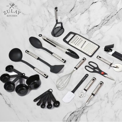 Zulay Kitchen 23 Piece Nylon Kitchen Utensils Nylon & Stainless Steel Non-Stick Cooking Utensils SetAll-in-one Kitchen Essentials: A wide selection of kitchen utensils made from stainless steel and heat-resistant nylon that are designed to be functional, attractive, and well-built. This 23 piece utensil set includes a spoon, ladle, turner, masher, egg whisk, flat grater, kitchen scissor, silicone spatula, pizza wheelZulay Kitchen